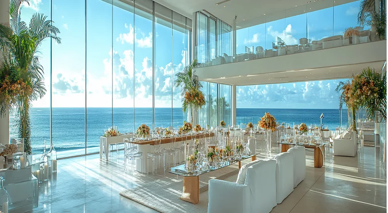 Les salles situées près de plans d’eau, qu’il s’agisse d’une villa au bord de la mer ou d’un espace avec vue sur un lac ou une rivière, créent une atmosphère paisible et sophistiquée. Ce type d’environnement est propice à la détente et à la convivialité, idéal pour des réceptions exclusives, mariages ou événements d’entreprise souhaitant marquer les esprits par un cadre exceptionnel.